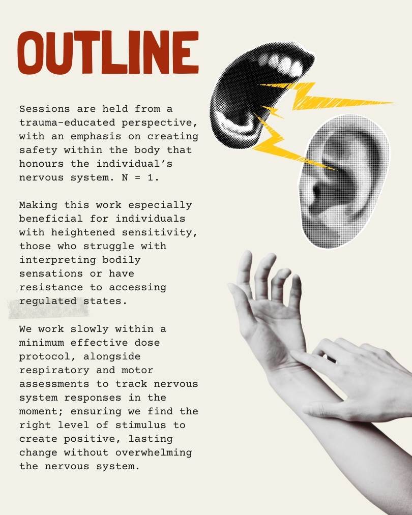 This work provides the opportunity to re-write ingrained beliefs and rewire automatic stress responses patterned into the nervous system, which are negatively impacting wellbeing and relationships. In a bottom up approach, clients learn how to safely process overwhelming sensory information at a trauma-informed miniumum effective dose, and learn simple effective tools they can use to respond to their nervous system’s needs in the present moment.